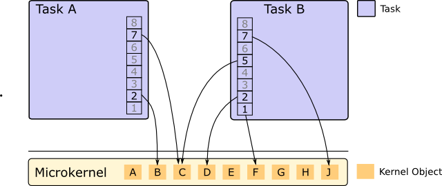 Generally, owning a capability means to be allowed to communicate with the object the capability points to. All user-visible kernel objects, such as tasks, threads, and IRQs, can only be accessed through a capability. Please refer to the Kernel Objects documentation for details. Capabilities are stored in per-task capability tables (the object space) and are referenced by capability selectors or object flexpages. In a simplified view, a capability selector is a natural number indexing into the capability table of the current task.